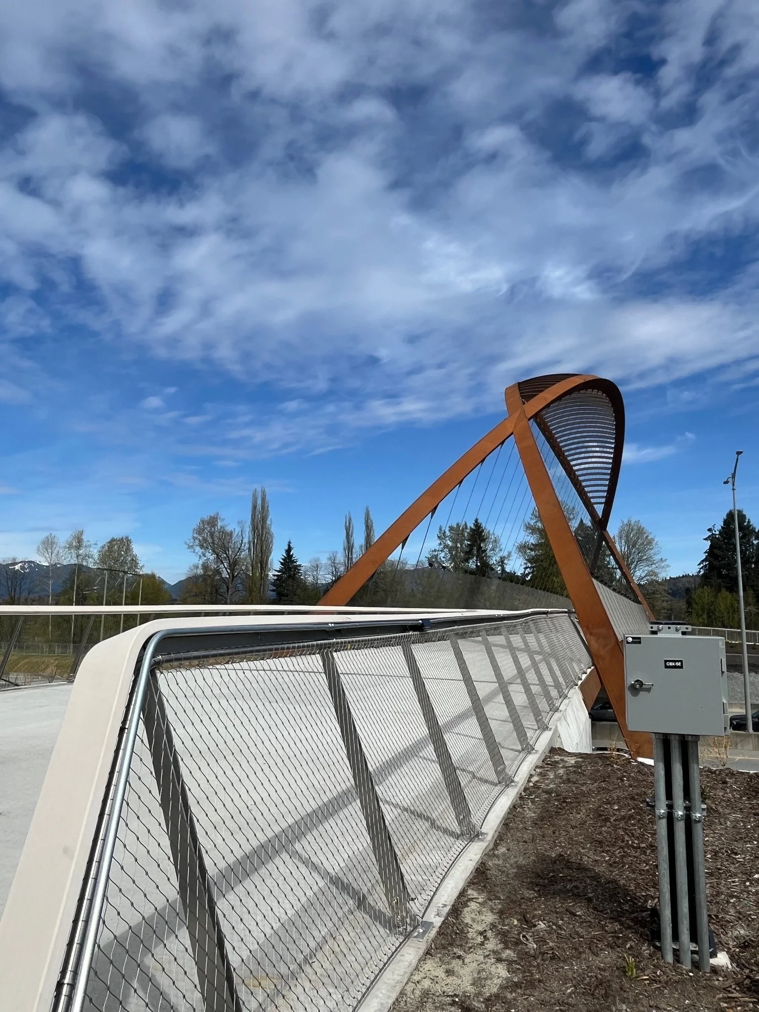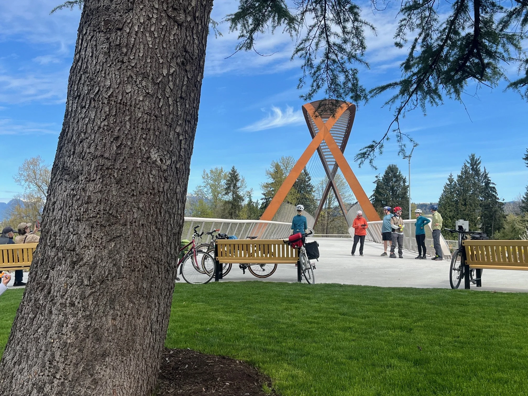 It took us a while to get out of downtown before picking up the Central Valley Greenway and heading east to the Christine Sinclair community centre for coffee and cake at Bastion, inside the community centre. Then ‘twas but a short ride to the new bridge, that straddles the highway. We soaked up the bridge ambience, commented about the noise and the unusual fencing arrangement, a stainless steel net. The bridge was an example of “build it and they will come”, plenty of people enjoying the day and the improved inter lake access.