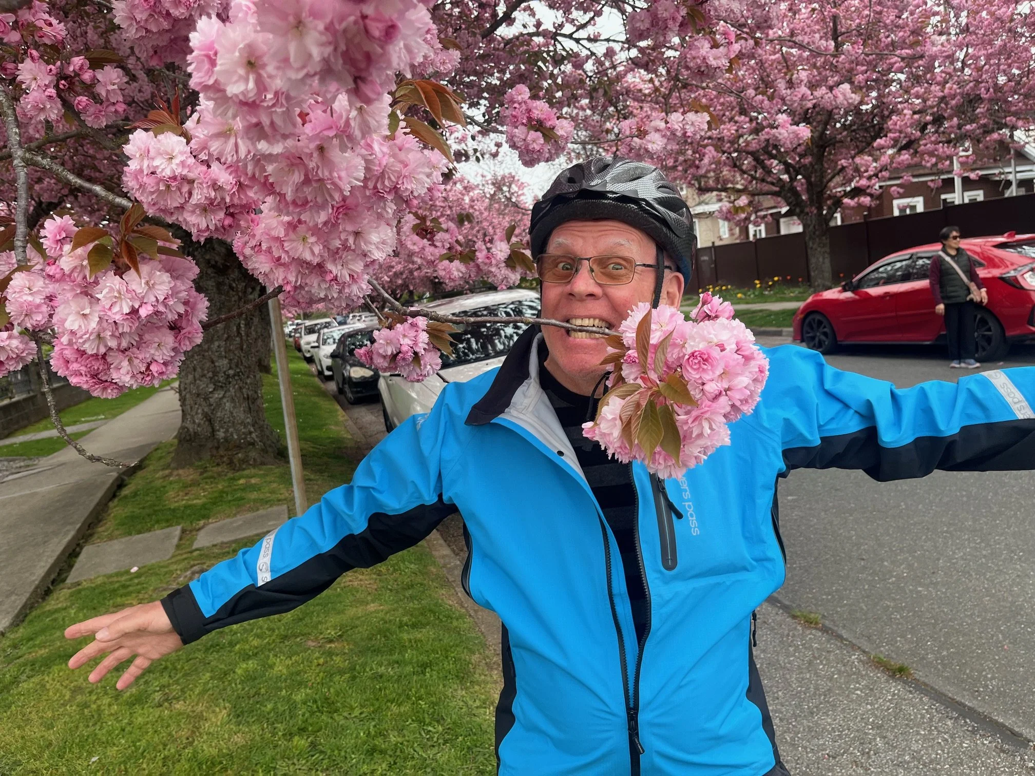 The bridge was the start of hill one of two for this largely flat ride, but this one hill was a bit challenging, especially as it was a couple of blocks on a fairly busy road. Drivers were well behaved though and we made it through to a more residential area where the blossoms really started to burst and we enjoyed beautiful views to the North Shore Mountains. Lunch stop was at Kisbey Park, notable for not having any views, which I felt was quite an achievement, given the plethora of available panoramas. The park approach also featured the only U-turn of the ride - well there’s always one.