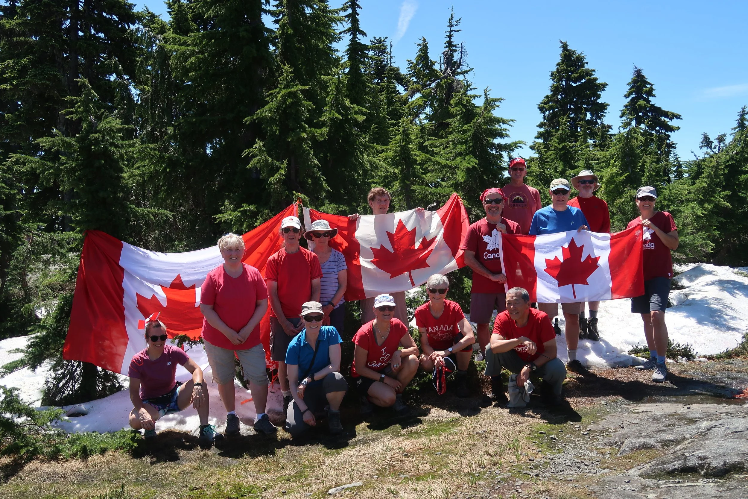 Many participants were wearing Canada flag T-shirts or wearing red and white clothing, and/or had Canadian flags poking out of their packs. We made a colourful procession going up the hill and a great colourful display at the top where we stopped for a leisurely lunch to enjoy the views, the weather, and the company (see photos). Many other hikers who'd also stopped at the top were so impressed by our flags that they asked to borrow them for celebration photos (and the obligatory Instagram photos).