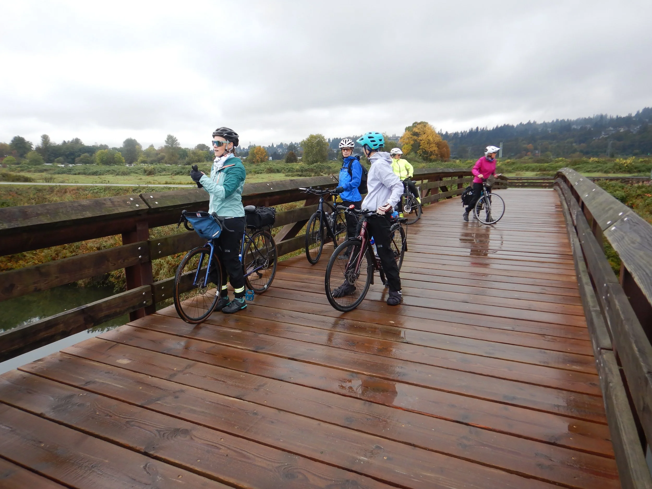 So the weather forecast for this bike ride was rain throughout the day. In the end it turned out that the first few hours were dry and then after that it was intermittent heavy rain, showers and a few dry bits. For this ride we used the Skytrain to get to LaFarge Lake Douglas, the very last stop on the Millennium Line. A couple of us arrived early enough to get coffee at a nearby cafe and once everyone else arrived we set off past the lake itself to encounter our first obstacle, a firmly closed trail. Handily a friendly local advised us of a short cut and we were soon back on track, heading south down the PoCo Trail to ƛ̓éxətəm Regional Park, offering its glimpses of the Port Mann Bridge before we crossed the Mary Hill bypass to head east along the Fraser to the Pitt River Bridge, crossing onto the dike system.