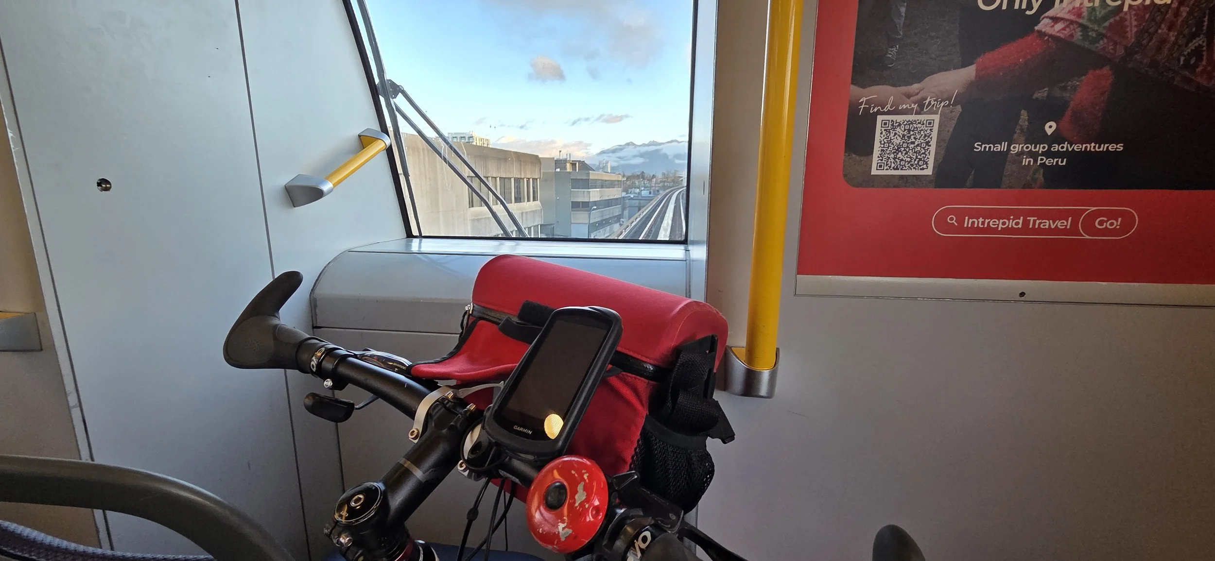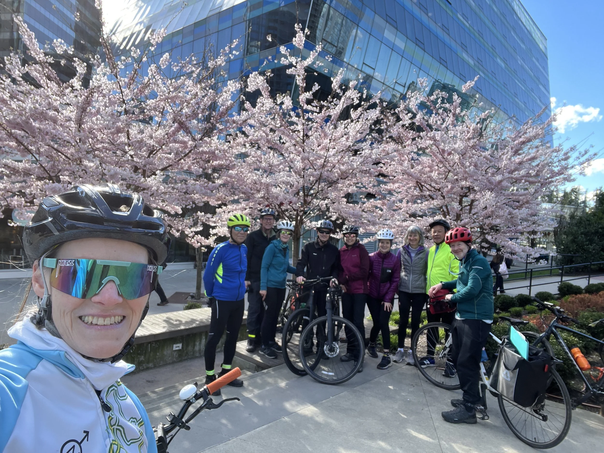 Then it was time to make our way east and north, starting on the banks of the Nikomekl River before rejoining the Rosemary Greenway. Some interesting features further north on the greenway where it was sometimes a proper bike path and then just nothing, anyway we made it. We connected with the Green Timbers Greenway and then west, passing the construction for the Skytrain extension and finally returning to King George for obligatory selfie with blossom before making our way home, bearing in mind the two bikes per carriage mandate from Transit.