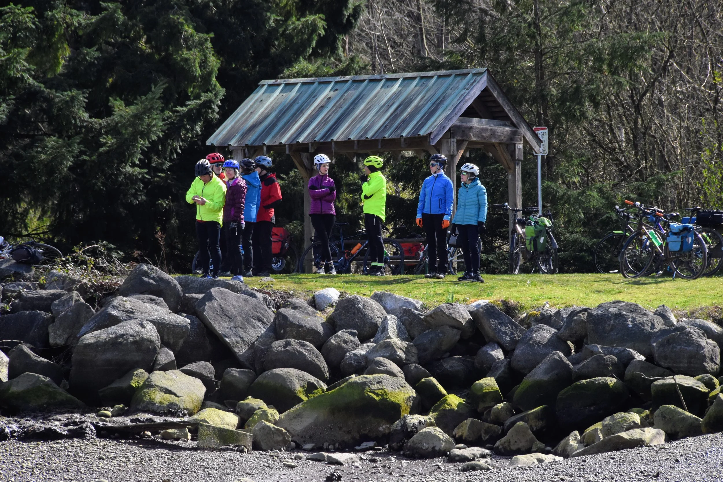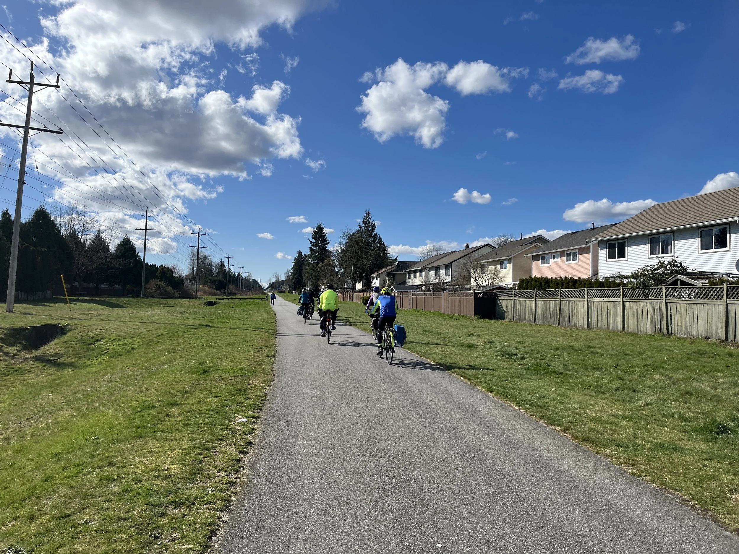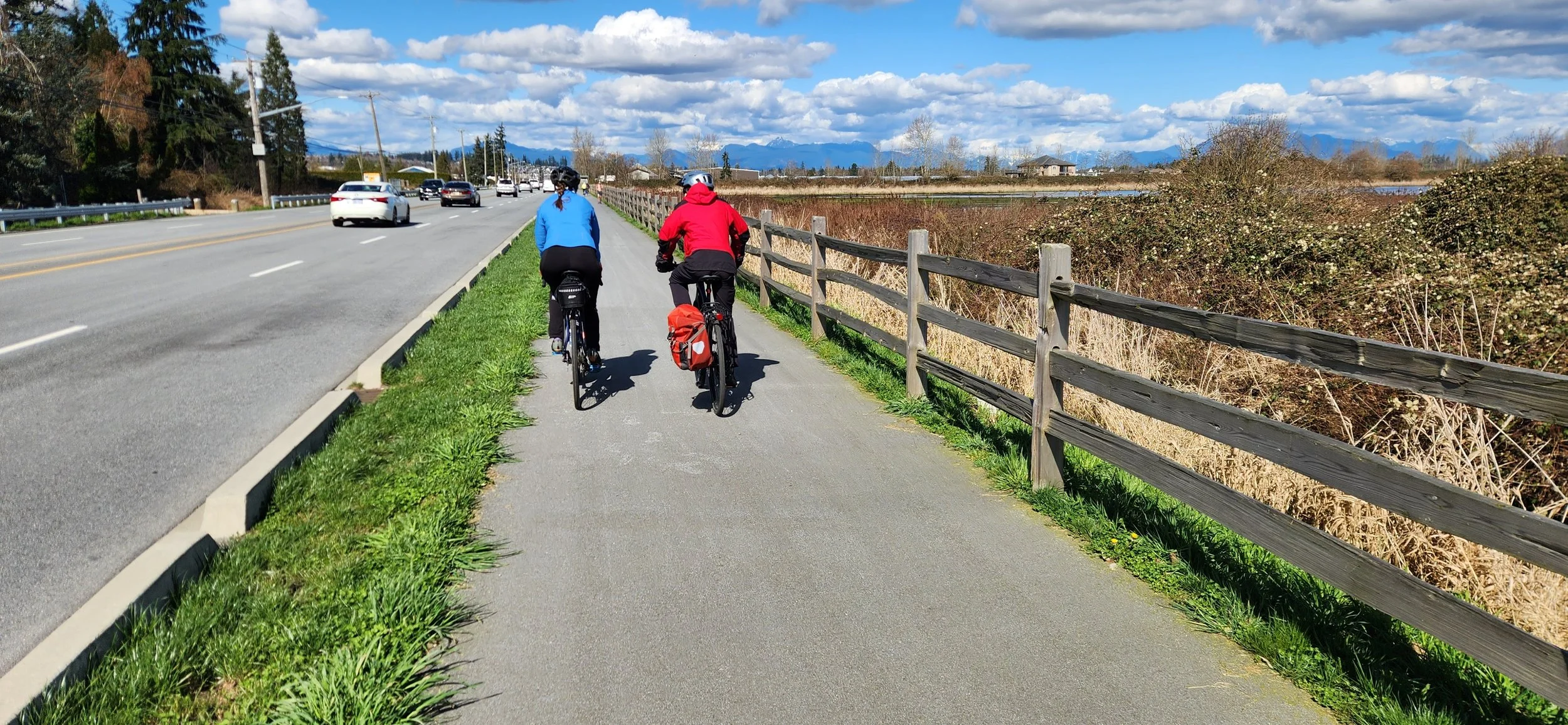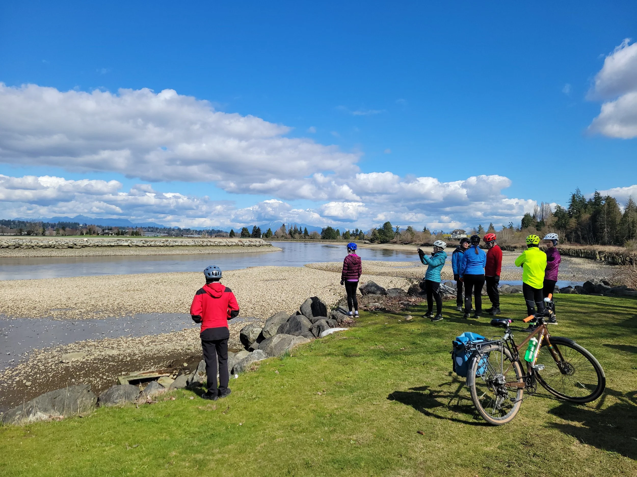 Even a start time of 0900 at King George meant that those leaving early were only just setting out in daylight with sunrise at 0713. However we did have a whole day ahead of us with twelve hours of daylight, the joy of the Equinox. High point of the transit journey was to see the progress at the stal̕əw̓asəm Bridge, the approach ramps are taking shape and now the line of the bike/pedestrian approach is clear. Roll on summer for that to open for cyclists and pedestrians, it’ll open up a lot more territory for our bike rides.