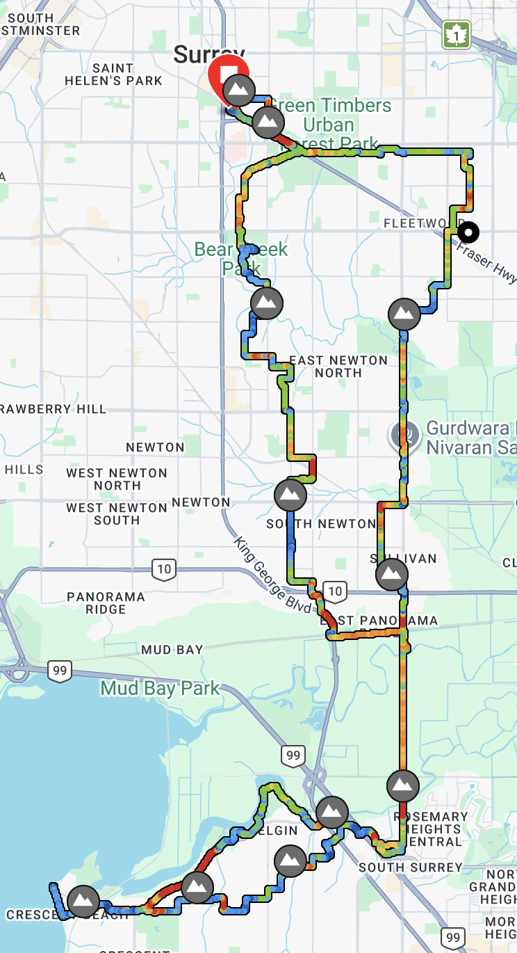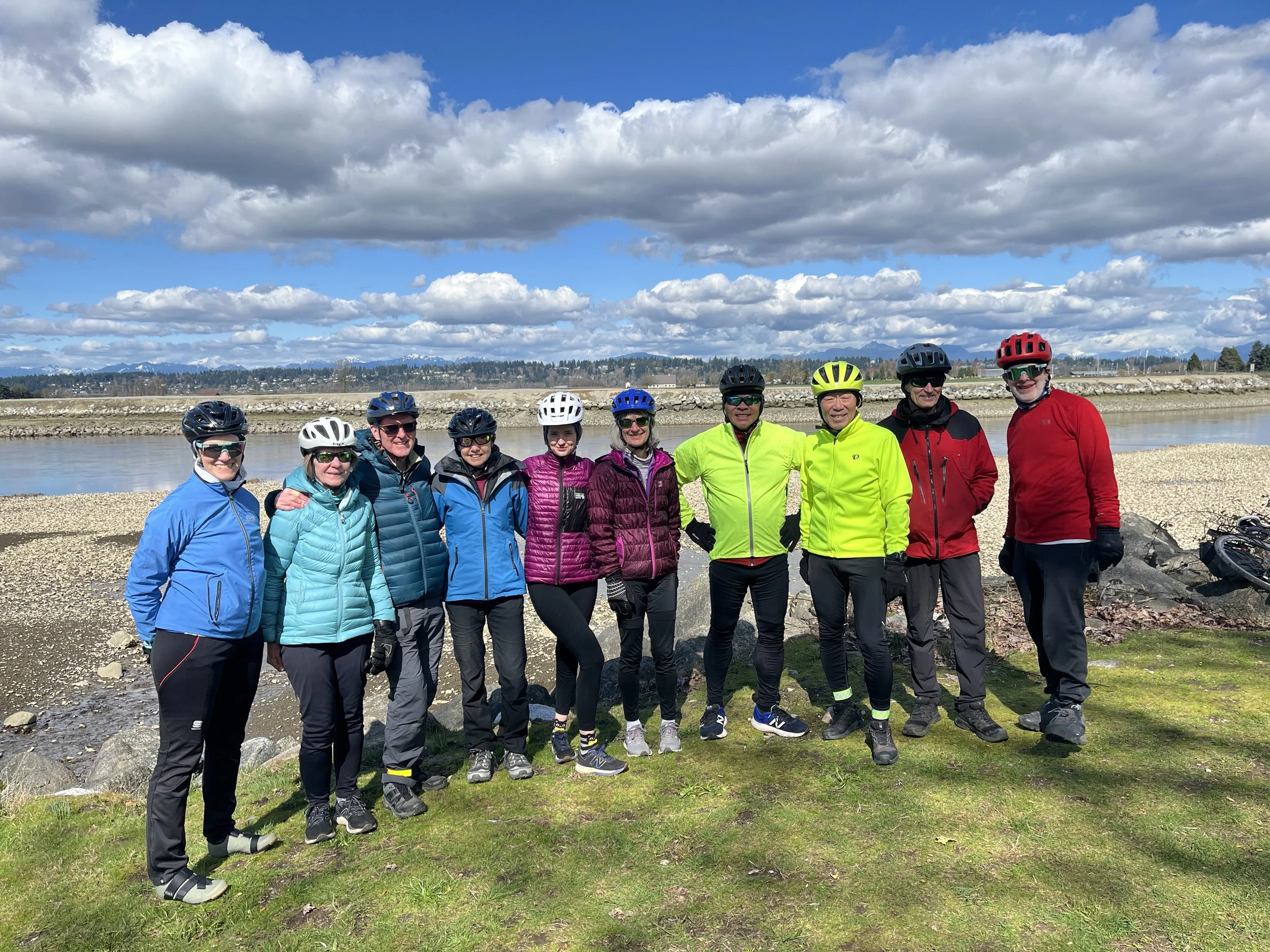 The idea for this ride was to use Transit to allow us to go further afield without the ride turning into a marathon. South and west from Vancouver often leads us into flatter territory so that was another advantage. We chose a meeting point of King George Skytrain and ten of us (nine members one guest) converged on that from as far away as West and North Van. Getting there involved some carrying of bikes as the elevator is out of action at Waterfront for the Expo line so that was a nice warm up exercise for most of the team as two flights of stairs needed to be negotiated.
