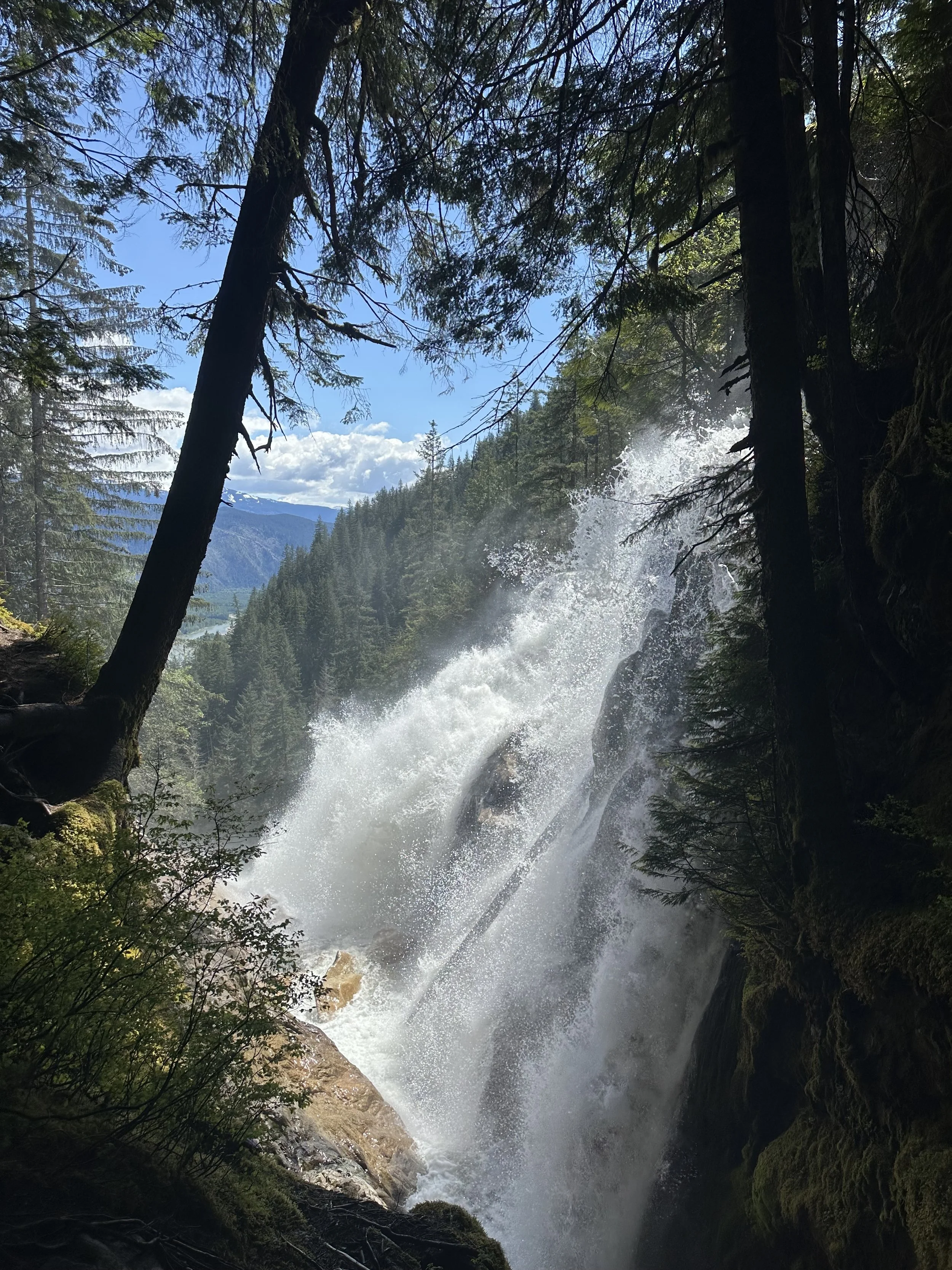 Leaving the trailhead at 1030 we were expecting a distance of about 7.5 km, 450 m of elevation gain and about 3.5 hours on the trail. In the end that is pretty much exactly what we got. Beyond the logistics though we found the trail to be very agreeable - not too much up, a surprising number of old growth trees and overall a lovely trail. The falls themselves were quite spectacular with a massive amount of water cascading over them. Those who had hiked this trail before reported that the water volume was at least double what they had seen before.