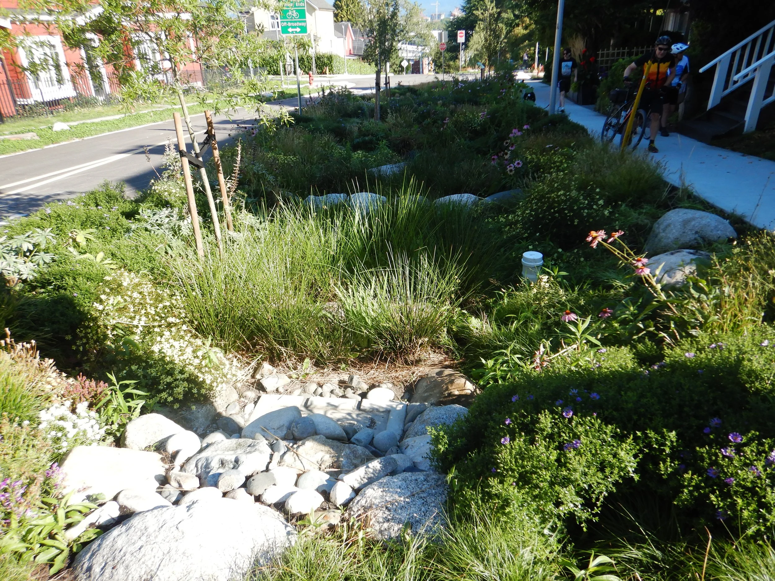 Our next Stop of Interest, as the highway signs say, was the Rainwater Garden/Daylighted Stream at 8th and St Georges. We had to backtrack to get to this as were too busy talking and missed the turning. The first plans for this came in 2005 and it’s nearing completion, the block to Broadway is the last to be done. What an amazing contribution to the street, parking replaced by a rainwater flower meadow.